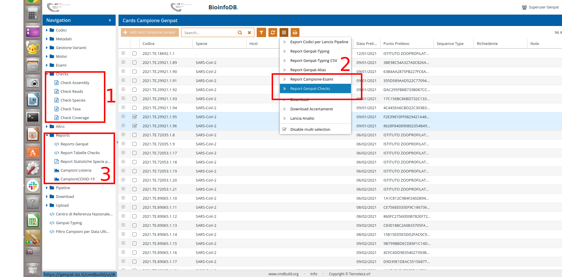 Per ogni controllo qualità, è possibile creare il report sia nella pagina dei report dal menù Reports > Report Genpat (3), sia nel menù contestuale Report Genpat-Checks (2) presente nella pagina dei campioni.