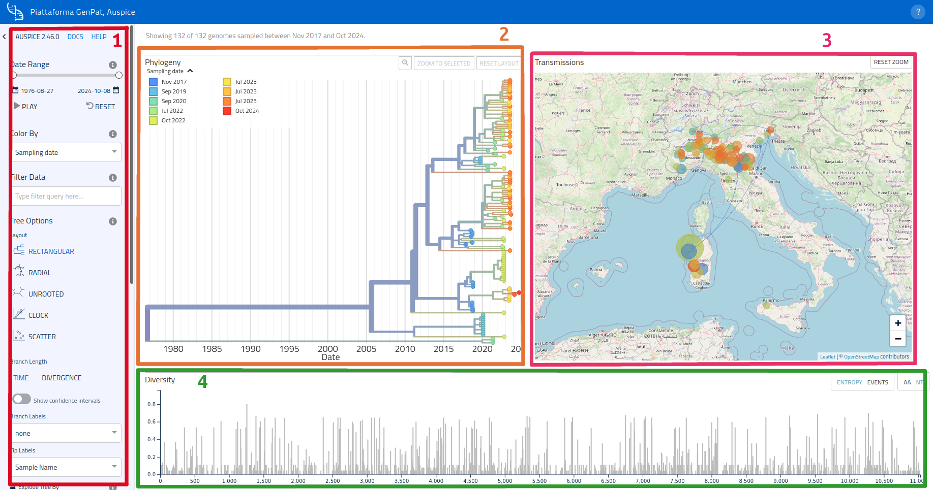 - grafico della diversità (del quale si può scegliere di visualizzare entropia o eventi), al di sotto di mappa e albero (4);