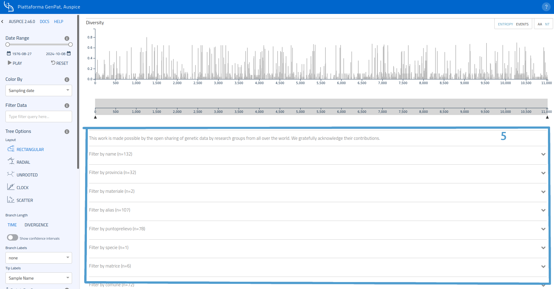 Sotto l'albero e la mappa è presente un terzo grafico (Nucleotide diversity of genome), che riporta la diversità tra i campioni, tenendo conto dei nucleotidi o degli amminoacidi (questi ultimi non disponibili per l'integrazione in piattaforma). Il grafico, inoltre, può mostrare la pagina "Entropia" o la pagina "Eventi" (il pulsante per passare da una pagina all'altra è nell'angolo in alto a destra) ed è possibile aumentare lo zoom sul grafico selezionando una finestra di valori nella linea graduata sottostante il grafico stesso.