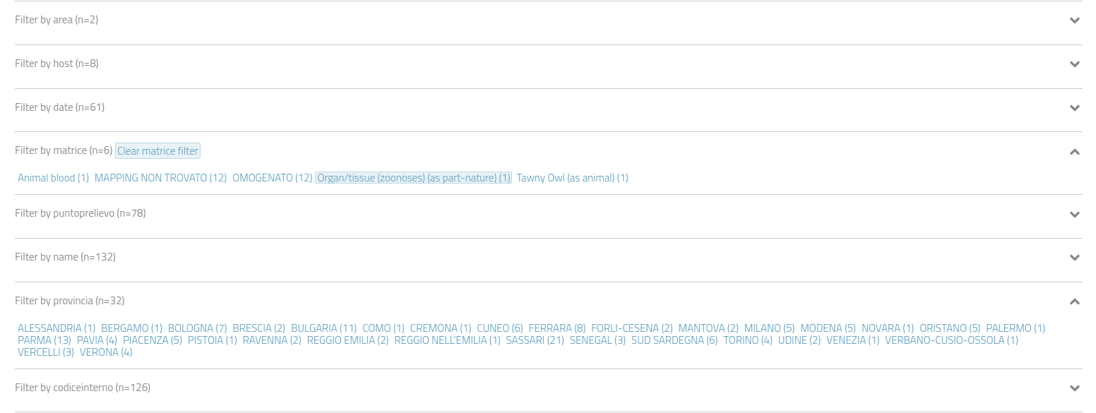 Esempio: per filtrare i campioni isolati nella provincia di Ravenna, è necessario aprire la scheda di metadati "Filtrare per Provincia" e cliccare su "Ravenna".