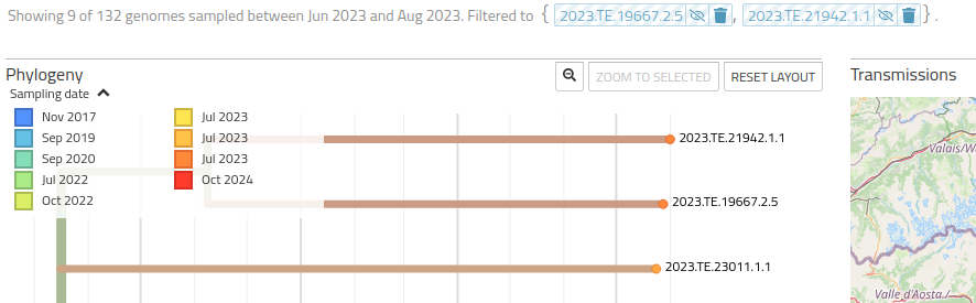 La dashboard Auspice, integrata alla piattaforma, permette di visualizzare, tramite il software omonimo, (consulta la guida ufficiale) gli alberi filogenetici, i metadati associati e i dati geografici prodotti dalla pipeline Augur.
