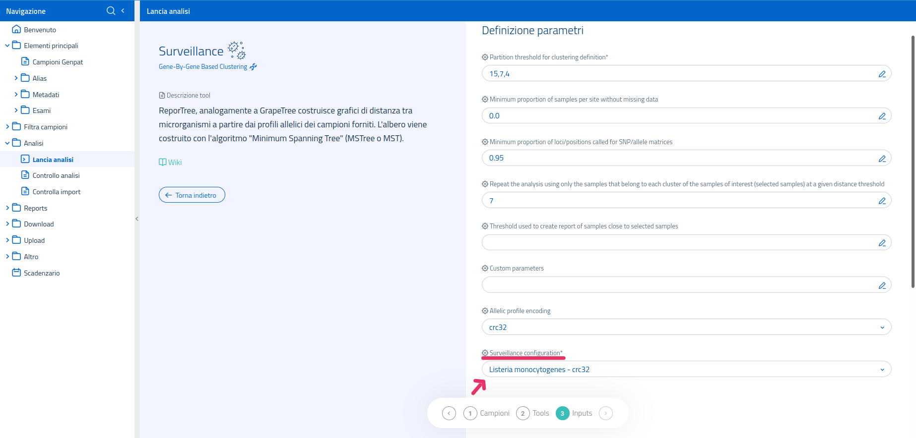 La pipeline Surveillance esegue ReporTree usando come campioni di interesse quelli specificati come input; inoltre, la matrice di distanza e l'albero sono calcolati usando tutti i campioni della specie indicata presenti in piattaforma.