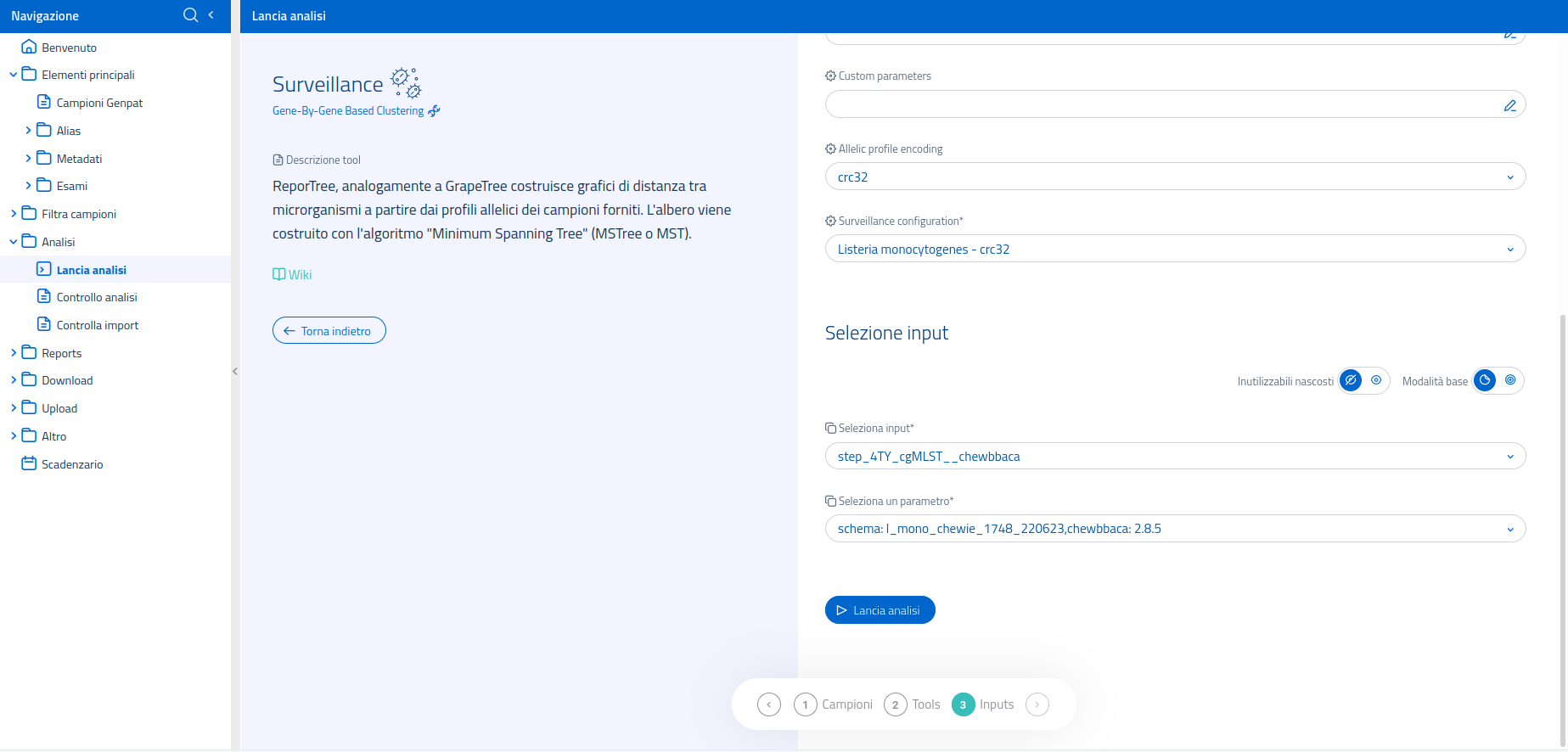 - Un normale lancio di ReporTree richiede di specificare i codici dei campioni di interesse tra quelli usati come input nel carrello o nel tag; nel lancio di ReporTree, tramite pipeline Surveillance, l'input è costituito solo dai campioni di interesse (ovvero, nel carrello attivato o nel tag attivo devono essere presenti solo tali campioni) che, quindi, non dovranno essere esplicitati durante la definizione dei parametri.