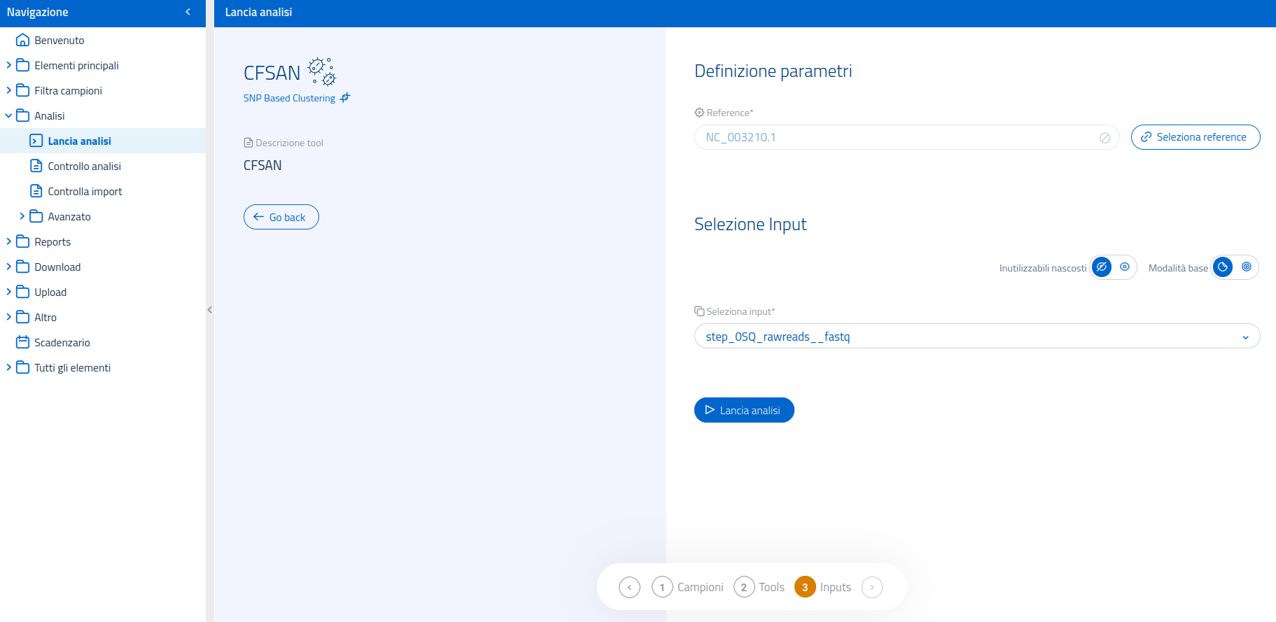 Nella schermata di definizione parametri sarà necessario specificare un genoma reference; inoltre l'interfaccia per la selezione dell'input mette a disposizione la modalità di selezione input avanzata, per permettere l'utilizzo di input processati da metodi diversi, usati a monte nel flusso di analisi. Nel caso di CFSAN, gli input sono sempre raw reads in formato FASTQ, ma possono essere interne (step_0SQ_rawreads__fastq) o importate in piattaforma (step_0SQ_rawreads__external).
