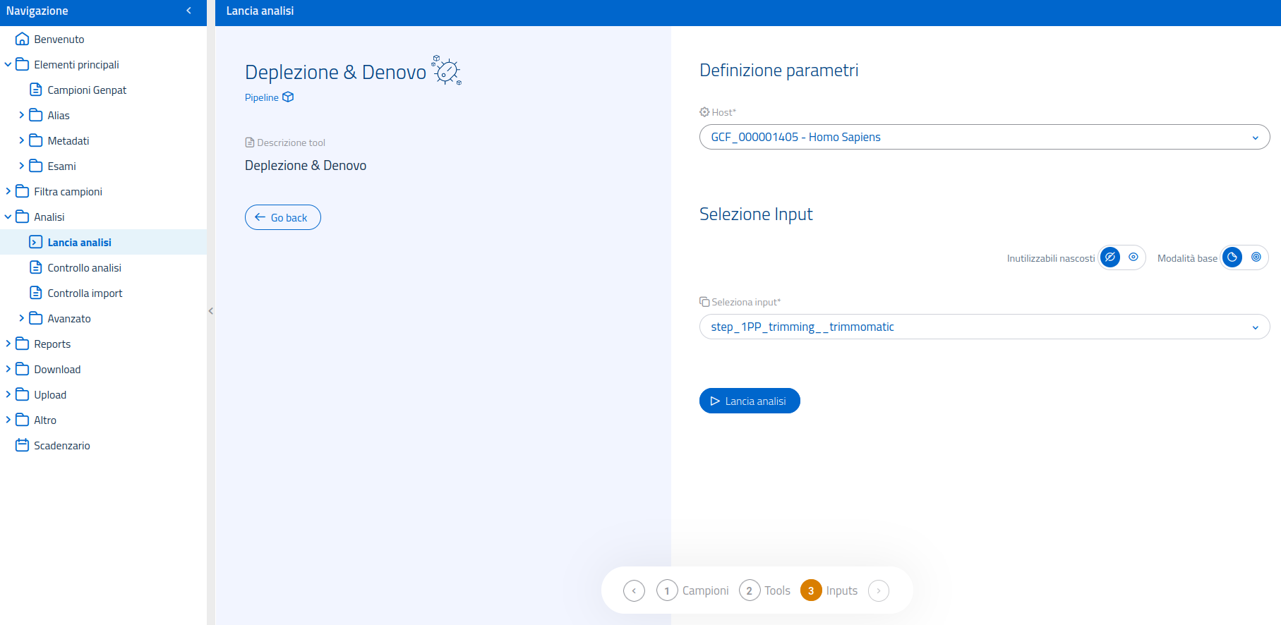 Nel sistema di lancio analisi, è possibile usare il filtro in alto per visualizzare esclusivamente le pipelines. Una volta selezionata la pipeline Deplezione & de novo nella pagina dedicata al lancio di analisi, il sistema passerà ad un'interfaccia di conferma.