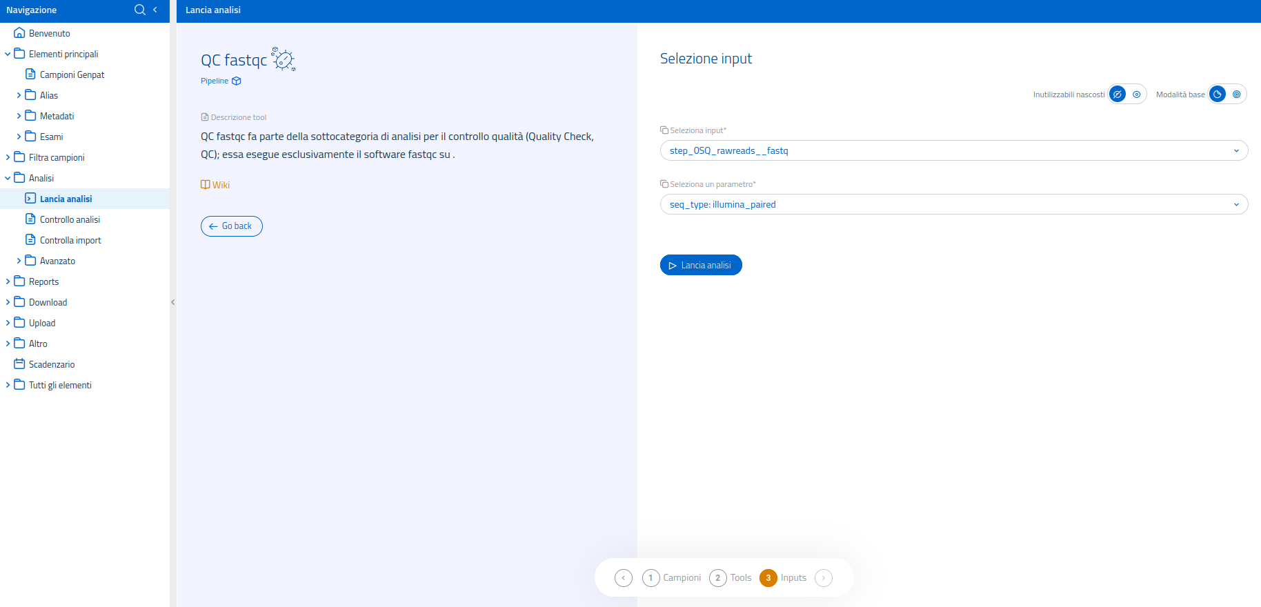 Nel sistema di lancio analisi, è possibile usare il filtro in alto per visualizzare esclusivamente le pipelines. Una volta selezionata la pipeline QC fastqc nella pagina dedicata al lancio di analisi, il sistema passerà ad un'interfaccia di conferma.