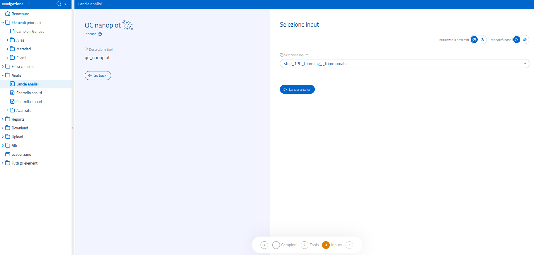 Nel sistema di lancio analisi, è possibile usare il filtro in alto per visualizzare esclusivamente le pipelines. Una volta selezionata la pipeline Nanoplot nella pagina dedicata al lancio di analisi, il sistema passerà ad un'interfaccia di conferma.