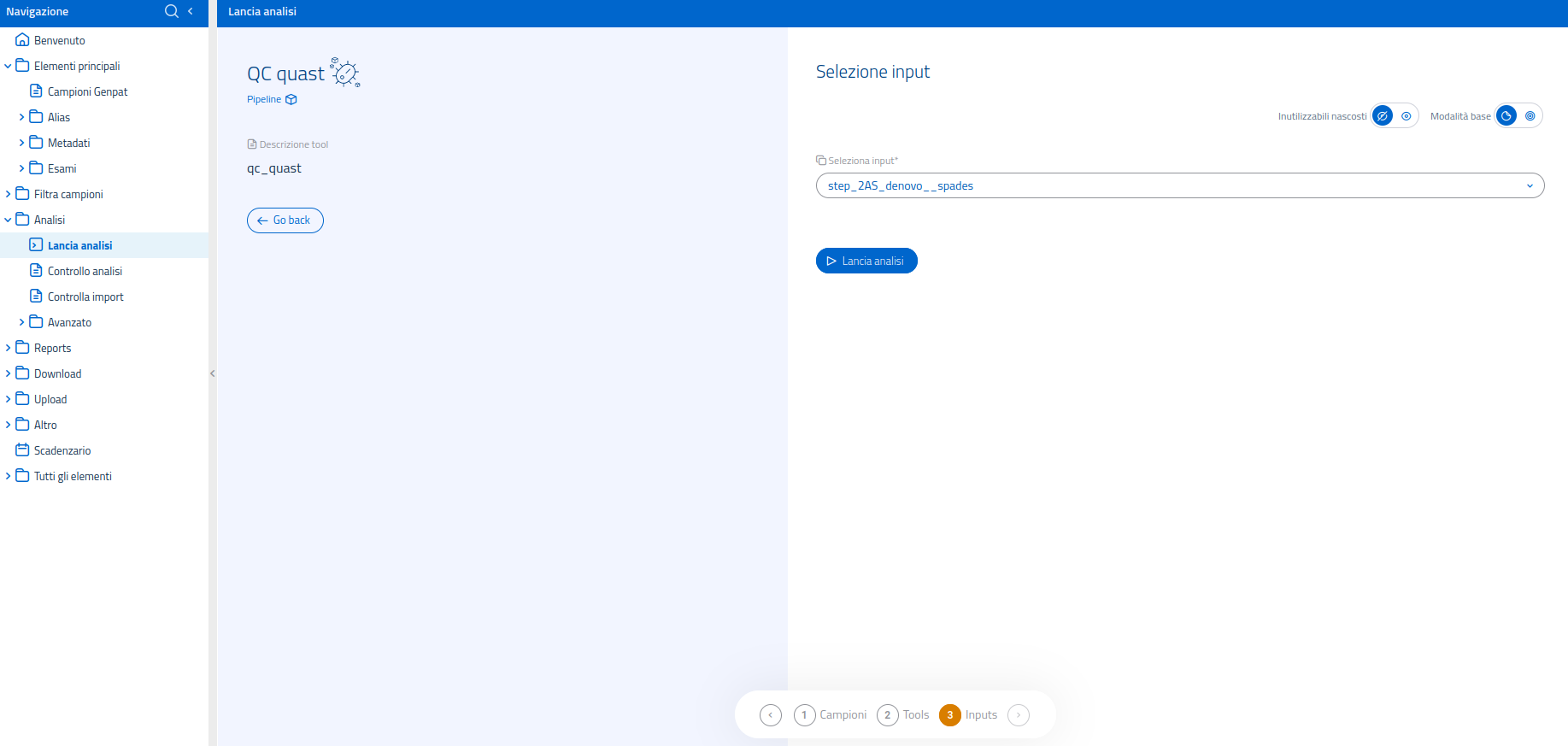 Nel sistema di lancio analisi, è possibile usare il filtro in alto per visualizzare esclusivamente le pipelines. Una volta selezionata la pipeline QC Quast nella pagina dedicata al lancio di analisi, il sistema passerà ad un'interfaccia di conferma.