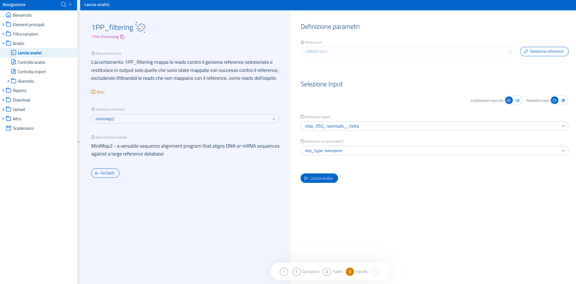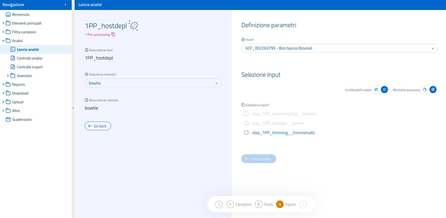 Una volta selezionata l'analisi 1PP_hostdepl nella pagina dedicata al lancio di analisi, sarà possibile selezionare il software bioinformatico ("metodo") da usare tra quelli disponibili per l'analisi. I tool utilizzabili per questa analisi sono: