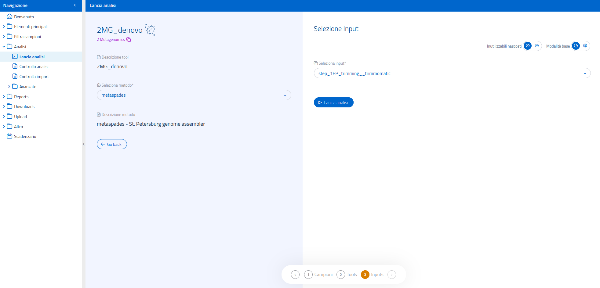 Una volta selezionata l'analisi 2MG_denovo nella pagina dedicata al lancio di analisi, sarà possibile selezionare il software bioinformatico da usare tra quelli disponibili per l'analisi. Il solo tool utilizzabile per questa analisi è:
