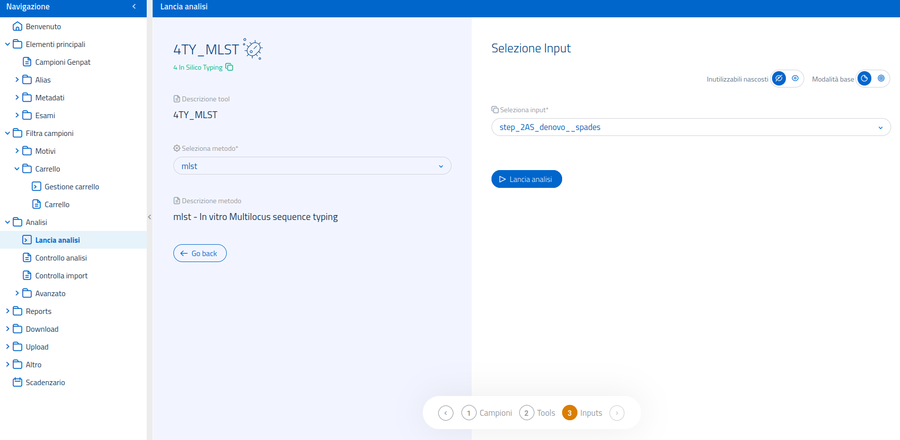 Una volta selezionata l'analisi 4TY_MLST nella pagina dedicata al lancio di analisi, sarà possibile selezionare il software bioinformatico da usare tra quelli disponibili per l'analisi. Il tool utilizzabile per questa analisi è: