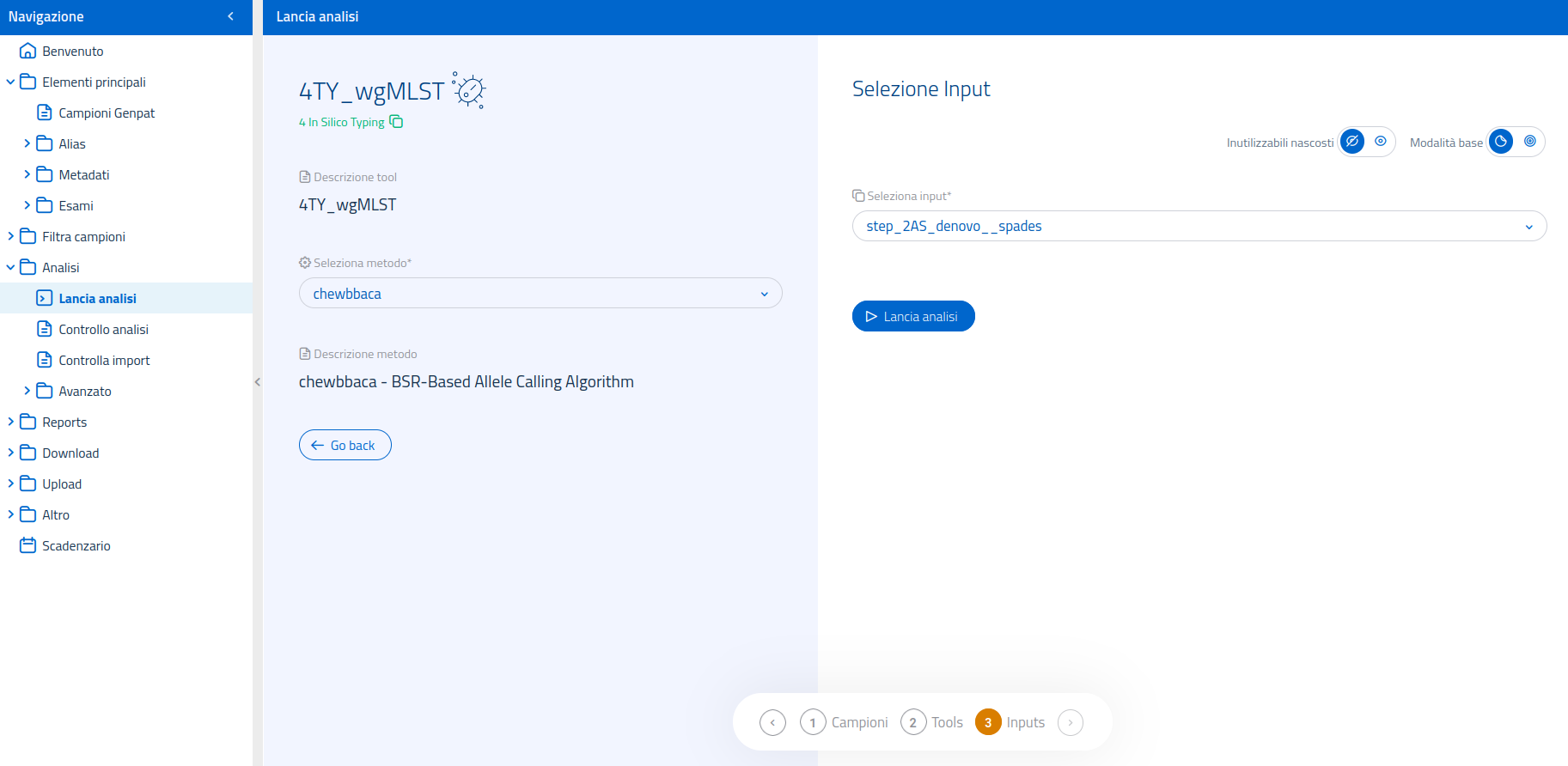 Una volta selezionata l'analisi 4TY_wgMLST nella pagina dedicata al lancio di analisi, sarà possibile selezionare il software bioinformatico (anche detto "metodo") da usare tra quelli disponibili per l'analisi. L'unico metodo utilizzabile per questo accertamento è chewBBACA - BSR-Based Allele Calling Algorithm.